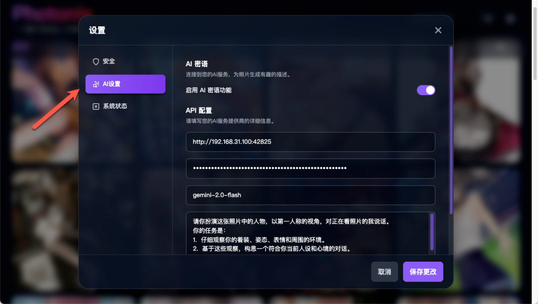 AI 密语,这也是整个项目最特别的地方了,按要求填写 AI 配置(调用的模型需要支持视觉)