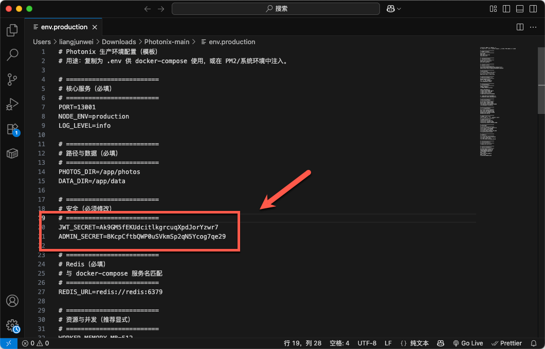修改一下密钥和口令(生成一个 32 位字符串即可)